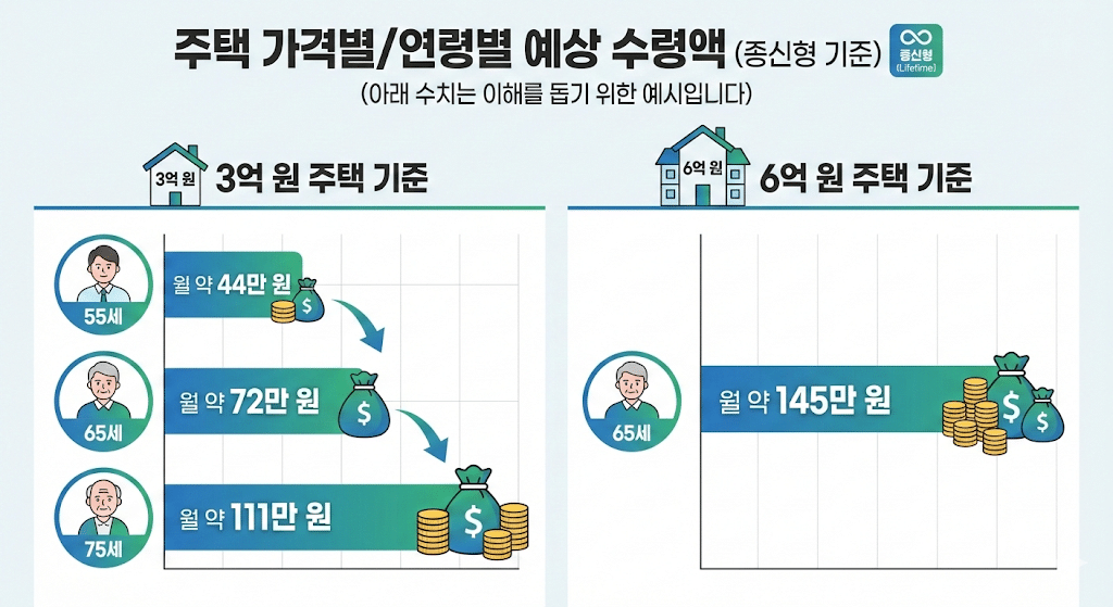 수령액은 가입 당시의 연령과 주택 가격에 따라 결정됩니다. 나이가 많을수록, 집값이 높을수록 매달 받는 금액은 커집니다.